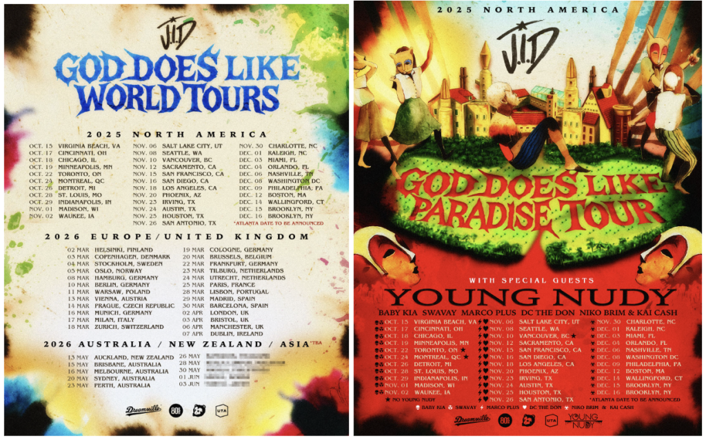 JID’s latest album, God Does Like Ugly, has been hailed as one of 2025’s strongest hip-hop releases, with critics praising its ambitious production and introspective storytelling. Featuring heavyweights like Clipse, Vince Staples, Ciara, and Westside Gunn, the album reflects JID’s evolution as an artist who carries “the weight of Atlanta’s past, present, and future” on his shoulders. The tour’s title, God Does Like Paradise, nods to the album’s themes of resilience and redemption, promising fans a live experience that’s both raw and reflective.